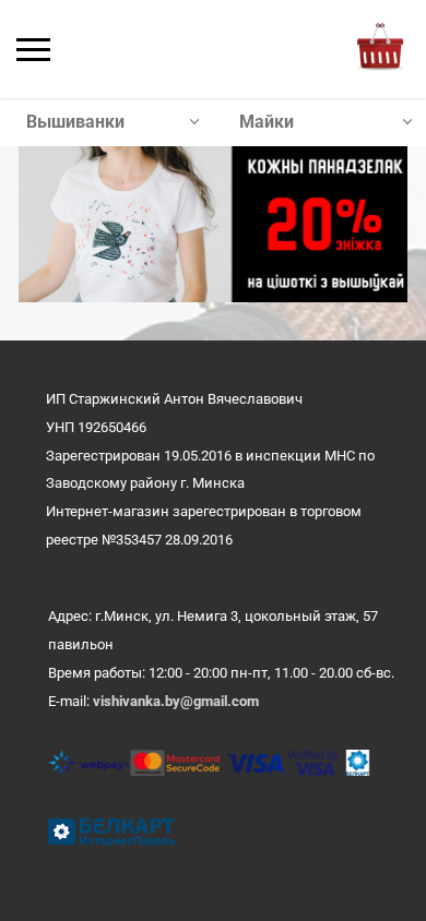 | AI-анализ | This website is an e-commerce platform selling various types of clothing and accessories, including women's, men's, and children's clothing, as well as hoodies, sweatshirts, and souvenirs. The title of the website is "vishivanka," and the description includes keywords related to clothing sizes, types, and measurements. The website is registered under the name "Starzhynsky Anton Vyacheslavovich" and was registered in the Ministry of Emergency Situations in Minsk in May 2016. The business is located in the Nezavisimostsi Square, 3, Cossack's Hall, Pavilion 57 in Minsk. The store operates from 12:00 to 20:00 on weekdays and 11:00 to 20:00 on weekends. Customers |