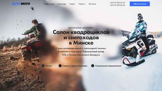 | AI-анализ | The web project "EliteMoto.by" is an online sales platform for all-terrain vehicles (ATVs), snowmobiles, and motor technology in Minsk, Belarus. The site offers a wide range of products in stock and is an official dealer for Polaris, CFMOTO, and Russkaya Mehanika brands. Special offers and warranties are provided. The site includes sections for sales, service, news, and contacts. The contact information includes phone numbers for sales and parts departments, as well as an option for a callback. The site also has a section for rules on data processing. The site contains information about TGB, a leading world producer of ATVs, and offers the ability to order from the TGB catalog with delivery to Belarus. The site also sells a new ATV brand, TGB, in Europe. The site is available in Belarus |