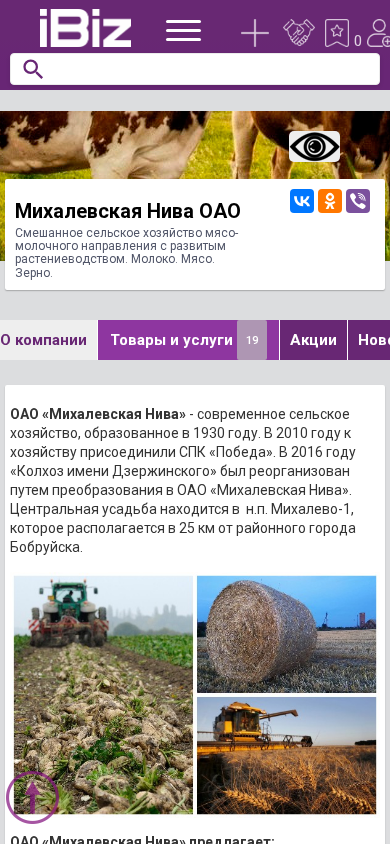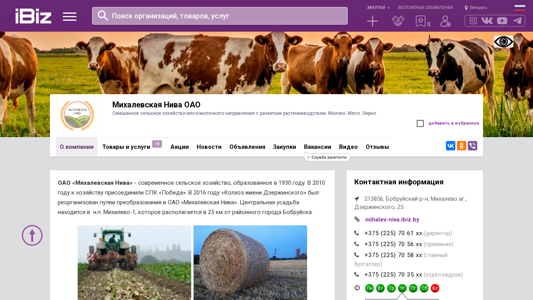 | AI-анализ | This online resource is dedicated to OAO "Mikhailovskaya Niva," a mixed agricultural enterprise focusing on meat-dairy and advanced farming. The company, established in 1930, expanded in 2010 by incorporating the SPK "Pobeda," and in 2016, reorganized "Kolhoz imeni Dzerzhinskogo" into OAO "Mikhailovskaya Niva." The central farmstead is located in the settlement of Mikhalevo-1, 25 km from the regional city of Bobruisk. OAO "Mikhailovskaya Niva" offers milk, beef, grain, rapeseed, sugar beets, and potatoes for sale. The primary revenue comes from milk, meat sales, and crop production. The total land area amounts to 6,949 ha |