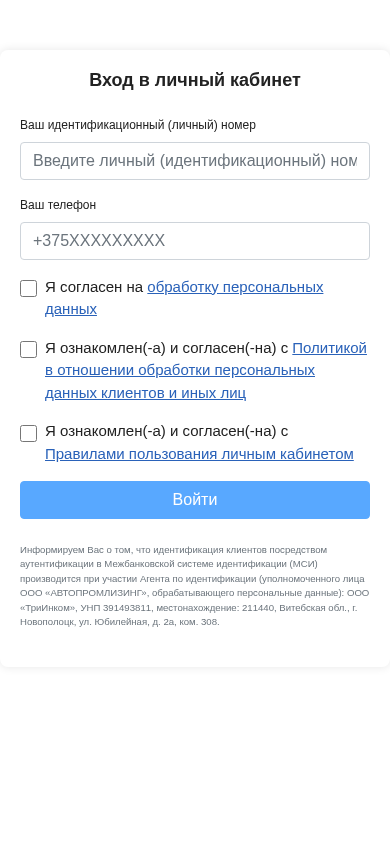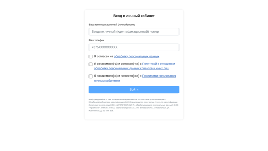 | AI-анализ | The web project "Вход в личный кабинет" (Access to personal cabinet) is a Belarusian website, where users are required to enter their personal identification number and phone number to gain access. The website informs users that they consent to the processing of their personal data and are familiar with the data processing policy and rules of use for the personal cabinet. The identification of clients is performed through the Interbank Identification System (МСИ) in collaboration with the authorized agent OOO «ТриИнком». The domain of the website is lk.aplbel.by. To proceed, users must agree to all terms and conditions, enter a code received via SMS for verification, and complete the identification process. |