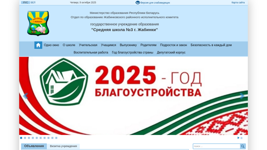| AI-анализ | This website is for the Middle School No. 3 in the city of Zhobinka, Belarus. The title of the site is 'Средняя школа №3 г. Жабинки'. The description field contains no useful information. The top keywords for this site include '2025', 'читать' (read), 'далее' (further), 'образования' (education), 'школы' (schools), 'новости' (news), 'школа' (school), 'общего' (common), 'среднего' (middle), 'работы' (works), 'учащихся' (pupils), '2026', 'детей' (children), 'безопасность' (safety), 'средняя' (middle), 'жабинки |