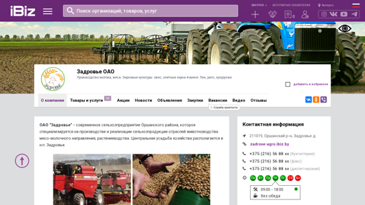 | Название / Заголовок | Задровье ОАО - Производство молока, мяса. Зерновые культуры: овес, элитные зерна ячменя. Лен, рапс, кукурузаю . 211019, , Задровье д. |