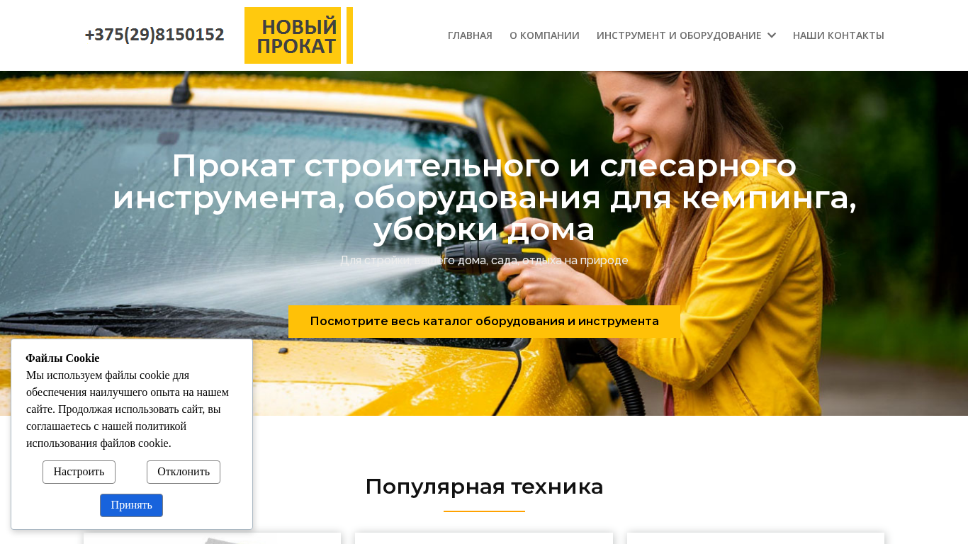 | AI-анализ | --- The website NovyProkat is the homepage for a rental service offering building and mechanical tools, camping equipment, and cleaning supplies. For construction, home improvement, gardening, camping, and tourism needs, customers can browse the full catalog of available equipment and instruments. The site includes sections for kitchen, office, and personal care products as well. Popular items include an Alpicool X50 auto refrigerator, a Camping World Thermobox 30 thermo container, a Bosch PBH 2100 RE perforator, and a Skiper LT4000B generator. Prices for the first few days and subsequent rental periods are provided for each item. |