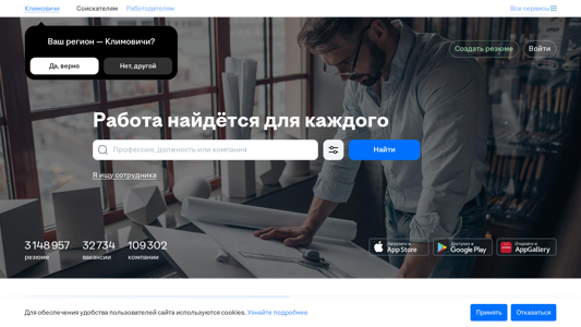| AI-анализ | The website klimovichi.rabota.by is a job search platform specifically for the city of Klimovichi in Belarus. It offers fresh job vacancies directly from employers in various professional fields. Users can search for jobs, post their resumes, and even create a profile to receive job offers. The site features multiple services including a help section and the ability for employers to post job listings. The user interface is available in both Russian and English. The website's top keywords include 'работа' (work), 'вакансии' (vacancies), 'климовичах' (Klimovichi), and 'rabota' (work). The site contains over 1.9 million unique pages, and at the time of analysis, there were 32,734 active job vacancies, 109,302 companies listed, and 3,1 |