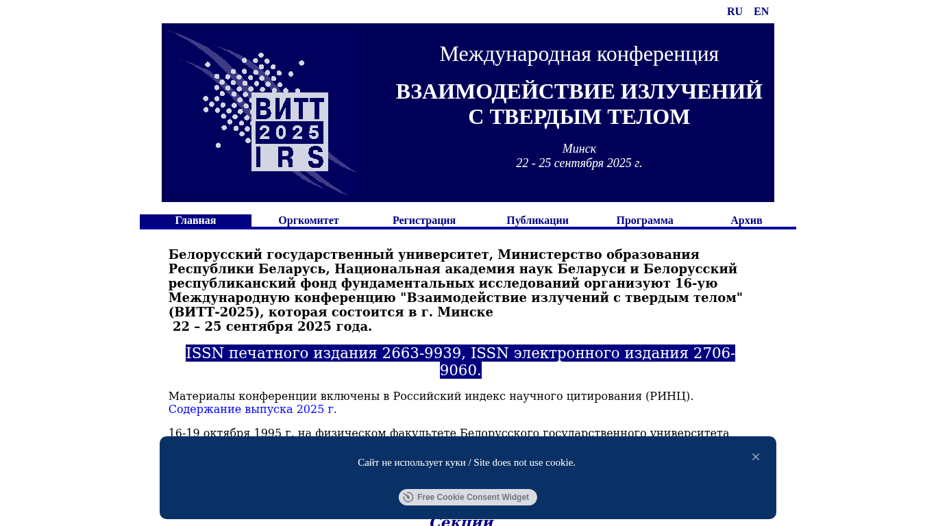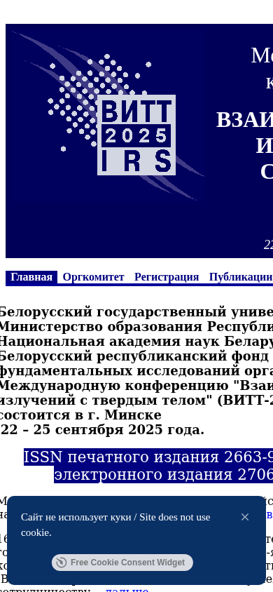| AI-анализ | The portal Interaction of Radiation with Solids is dedicated to the 16th International Conference on the Interaction of Radiation with Solids (ВИТТ-2025), which will take place in Minsk, Belarus, from September 22 to 25, 2025. The conference is organized by the Belarusian State University, the Ministry of Education of the Republic of Belarus, the National Academy of Sciences of Belarus, and the Belarusian Republican Foundation for Fundamental Research. The conference aims to discuss current issues related to the interaction of radiation and plasma with solid matter within the following sections: Processes of radiation and plasma interaction with solid matter, Radiation effects in solids, Influence of radiation on material structure and properties, Nanomaterials: formation and properties under radiation influence, and Methods, equipment, plasma and |