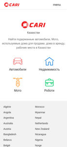 | AI-анализ | The portal Carikazak.com is a marketplace for buying and selling used cars, motorcycles, homes for rent, and job listings in Kazakhstan. Users can search for various categories including 'Automobiles', 'Moto', 'Real Estate', and 'Jobs'. The website also supports multiple countries, listed in the footer, including Algeria, Angola, Argentina, Australia, and many more. |