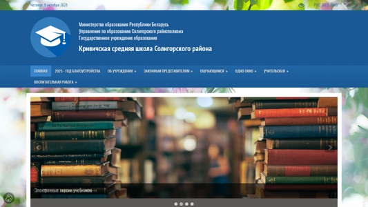 | AI-анализ | The web project "Кривичская средняя школа Солигорского района" (Krivichi Secondary School of Soligorsky Region) is a Belarusian educational institution domain, with the title "Кривичская средняя школа Солигорского района" (Krivichskaya Srednyaya Shkola Soligorskogo Raiona) and the description "Четверг, 9 октября 2025. Выбраць мову Беларуская" (Thursday, 9 October 2025. Choose the Belarusian language). The most frequent keywords are "2025" (26 occurrences), "подробнее" (detailed, 25 occurrences), "беларусь" (Belarus, 11 occurrences), "моя" ( |