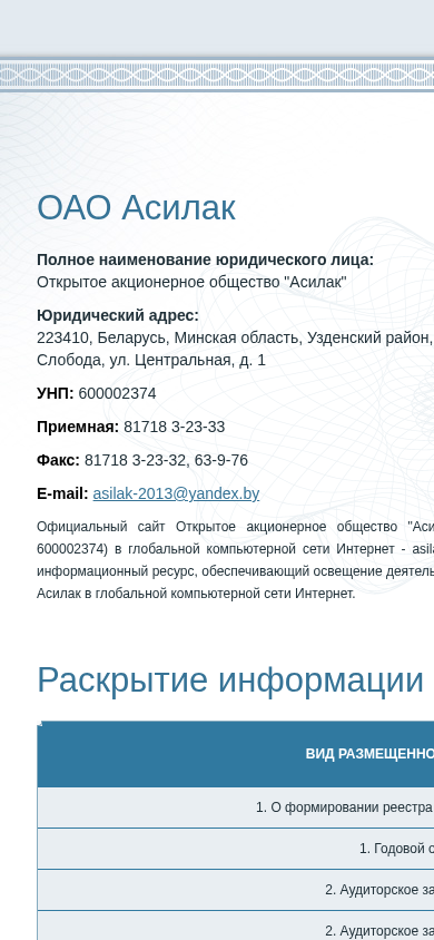 | AI-анализ | The website asilak.epfr.by is the official online platform for Open Joint Stock Company (OJSC) "Asilak" (UNP 600002374) based in Belarus. It provides information on the company's activities in the global computer network Internet. The website includes announcements for shareholder meetings, such as in-person and virtual annual and extraordinary general meetings held on various dates from February 2022 to May 2025. Additionally, the website offers downloadable documents including annual reports and auditor's conclusions for the years 2019 to 2025 and the formation of shareholder registers. |