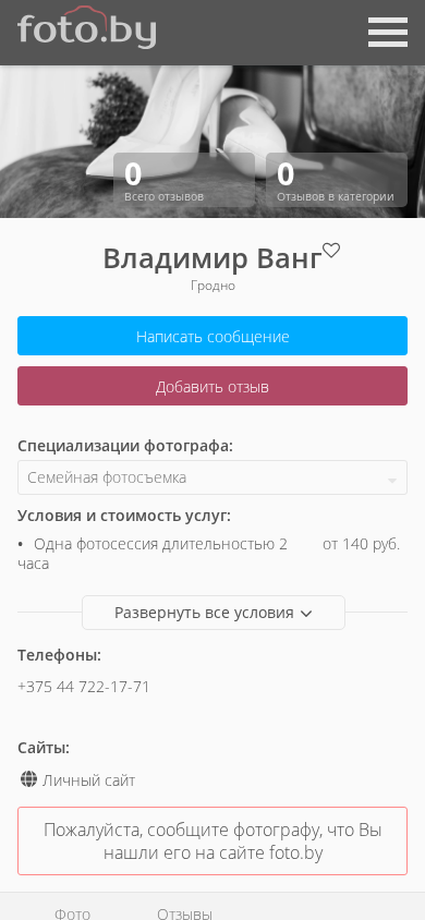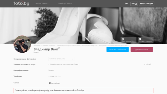 | AI-анализ | This website is a photography portfolio of Vladimir Vang, a photographer based in Grodno, Belarus. The website features photographs in the "Family Photoshoot" category. Vladimir works as a Love Story, children, and wedding photographer in the cities of Grodno, Minsk, Brest, Sloym, Lida, Cobrin, and Novogrudk. |
