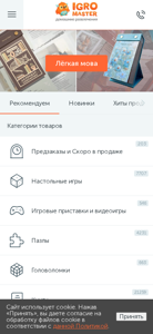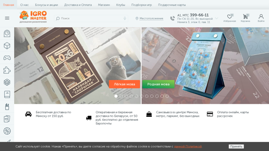 | AI-анализ | --- This online resource is an e-commerce website specializing in the sale of board games. The website, igromaster.by, offers a wide selection of popular and classic board games at competitive prices, with discounts and promotions regularly available. The site includes categories for various types of games, such as economic, strategic, detective, quest, cooperative, role-playing, and more, catering to different player preferences and group sizes. The store also sells related accessories, such as game protectors, cubes, and game boards for children. The website features a catalog for browsing and searching, as well as a cart and checkout process. The store is located in the Neimiha 3 shopping mall, on the first floor, and is open from Monday to Saturday, 11 a.m. to 8 p.m., and Sundays and holidays, closed. The website offers a variety |