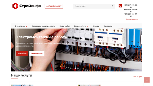 | AI-анализ | The website is a construction and installation company based in Minsk, Belarus. The company offers a full range of construction and installation services for repairs, renovations, modernizations, and new constructions. The keywords for the website are 'construction and installation works'. The top words used on the website include 'works', 'construction and installation', '375', 'jobs', 'questions', 'our', 'modernizations', 'reconstructions', 'ODO', 'stroyinfo', 'repairs', 'capital', 'remodeling', 'electromontage', 'production', 'electromontage works', 'any', 'objects'. The website includes information about the company's services, portfolio, and contact details. The domain name for the website is 'stroyinfo.by'. |