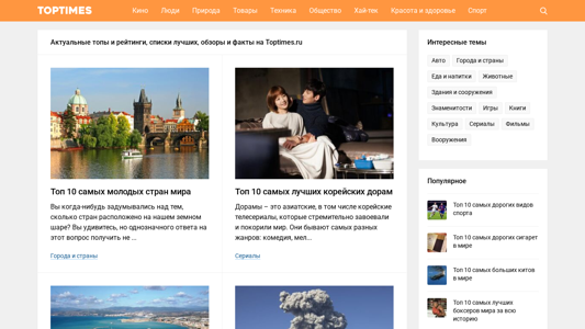 | AI-анализ | The website Toptimes.ru is a popular entertainment and informational resource. On this site, reviews, ratings, interesting facts, and lists of the best are published on various topics. These topics include movies, series, films, famous people, psychology, nature, animals, goods, food and drinks, books, technology, automobiles, motorcycles, aircraft, society, weapons, cities and countries, buildings and structures, culture, education, finance, high-tech, games, beauty and health, and sports. Some examples of the specific topics covered are: the top 10 youngest countries in the world, the top 10 best Korean dramas, the top 10 most dangerous airports in the world, the top 10 most dangerous volcanoes in the world, the top 10 youngest cities in Russia, and the top 10 most popular games in history. The website also features articles |