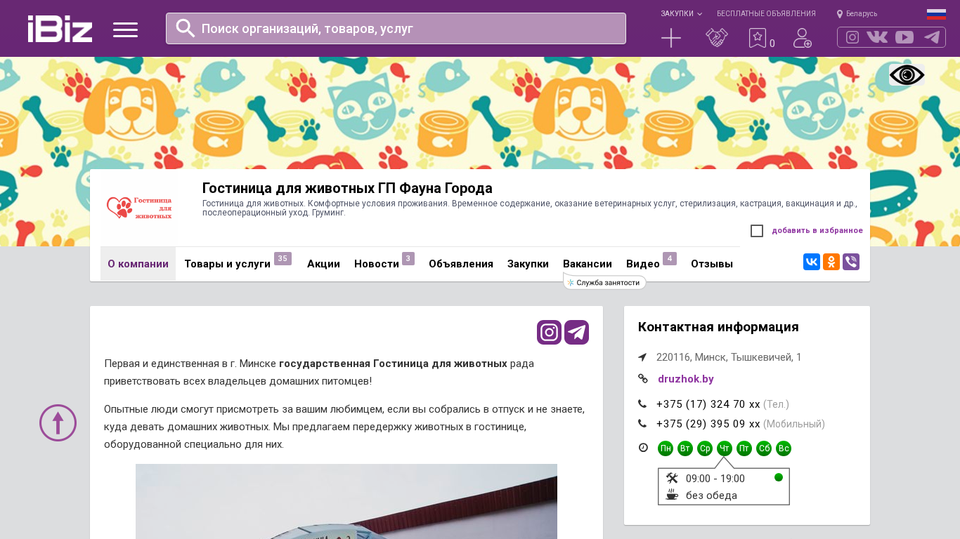 | Название / Заголовок | Гостиница для животных ГП Фауна Города - Гостиница для животных. Комфортные условия проживания. Временное содержание, оказание ветеринарных услуг, стерилизация, кастрация, вакцинация и др., послеоперационный уход. Груминг.. 220116, Минск, , Тышкевичей, 1 |