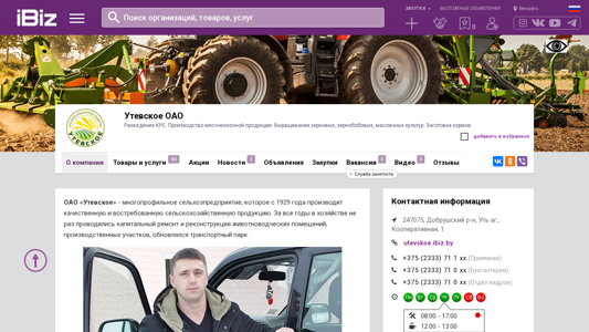 | AI-анализ | This portal is a Belarusian agricultural cooperative named Utevskoe OAO, which has been in operation since 1929. The cooperative specializes in the production of high-quality dairy products, meat, and cultivation of various crops, including grains, legumes, and oilseeds. The site also mentions the collection and storage of feeds. The company's operations include milk production, cattle breeding, and farming of grain and oilseed crops. The farm boasts modern facilities and equipment, with recent renovations and expansions, including a new grain drying complex and the upcoming completion of a pig farm this year. The primary revenue sources for the cooperative are milk sales, which account for 60.3% of the total revenue, and crop farming, which accounts for 20%. The site offers information on the company's products and services, as well |