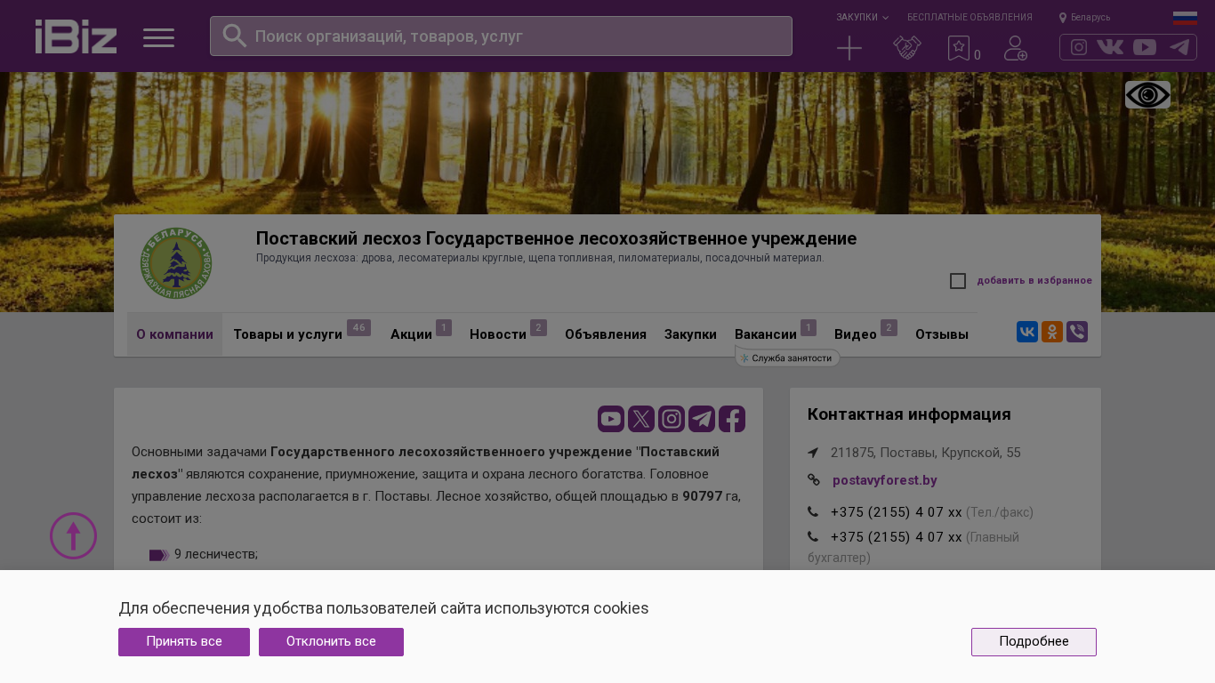 | Название / Заголовок | Поставский лесхоз Государственное лесохозяйственное учреждение - Продукция лесхоза: дрова, лесоматериалы круглые, щепа топливная, пиломатериалы, посадочный материал.. 211875, Поставы, , Крупской, 55 |