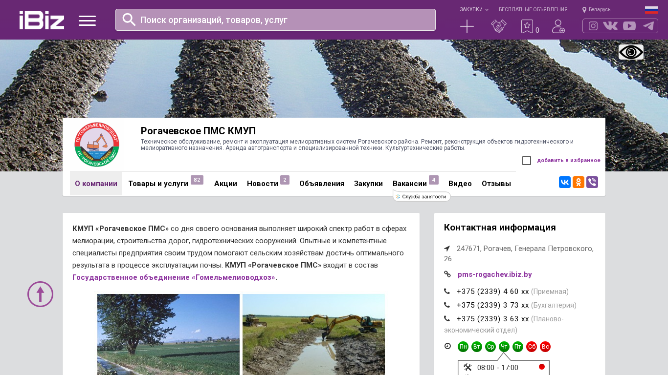 | Название / Заголовок | Рогачевское ПМС КМУП - Техническое обслуживание, ремонт и эксплуатация мелиоративных систем Рогачевского района. Ремонт, реконструкция объектов гидротехнического и мелиоративного назначения. Аренда автотранспорта и специализированной техники. Культуртехнические работы.. 247671, Рогачев, , Генерала Петровского, 26 |