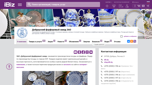 | AI-анализ | The website is a Belarusian e-commerce platform specializing in the production and sale of tableware and other household items made of fritware. The company, Dobrushsky Farforowy Zavod ZAO, is a leading producer of fritware in the CIS countries, offering a wide range of products including dinnerware sets, tea and coffee services, and sundry items. The website features a catalog of their offerings, with categories such as plates, bowls, cups, and various sets. A section of the site is dedicated to restaurant and hospitality industry supplies (HoReCa). The site also includes a section for free classified listings, as well as a company profile, contact information, and a link to their online store. Keywords related to this website include 'pottery', 'tableware', 'dinnerware', 'tea set', 'coffee set |