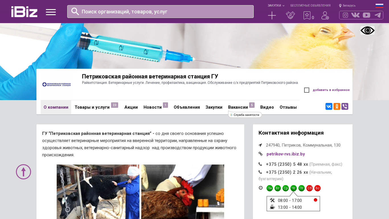 | AI-анализ | The website is for Petrikov Regional Veterinary Station GU - Rayvetstation, offering veterinary services including treatment, prevention, and vaccination for livestock farms in Petrikov District. The address is given as Коммунальная 130 in Petrikov, Belarus, 247940. The website includes a map for directions, contact telephone numbers, and information about the company. |