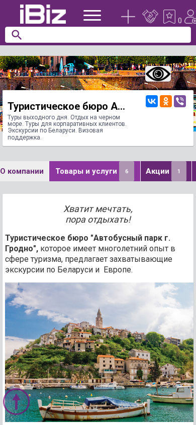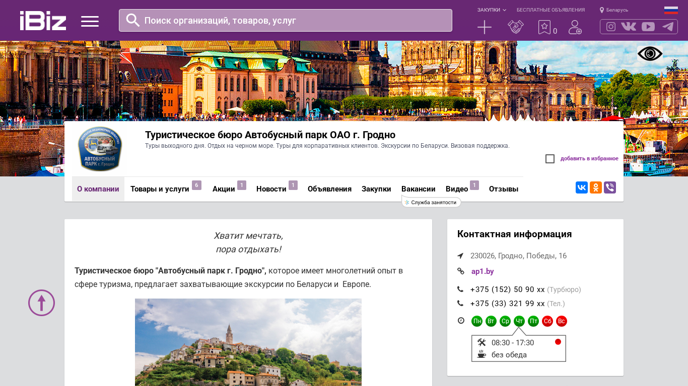 | Название / Заголовок | Туристическое бюро Автобусный парк ОАО г. Гродно - Туры выходного дня. Отдых на черном море. Туры для корпаративных клиентов. Экскурсии по Беларуси. Визовая поддержка. . 230026, Гродно, Победы, 16 |