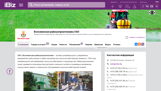 | AI-анализ | The website is for Volzhynskaya rayagropromtekhnika OAO, an industrial production company specializing in the manufacturing of plastic items, providing industrial services and agricultural machinery repairs. The company, established in 1939, is located in Volzhyn, Belarus, at Chapayeva Street 38. Their main activities include the production of plastic goods using injection molding and extrusion techniques, agricultural machinery repairs and maintenance, and agrochemical services for agriculture. The website provides information on their products, services, and contact details. The structure of the company includes production units, an agrochemical services division, repair and mechanical workshops, and an auto transport department. They manufacture various plastic components for refrigerators, tractors, and dairy installations. |