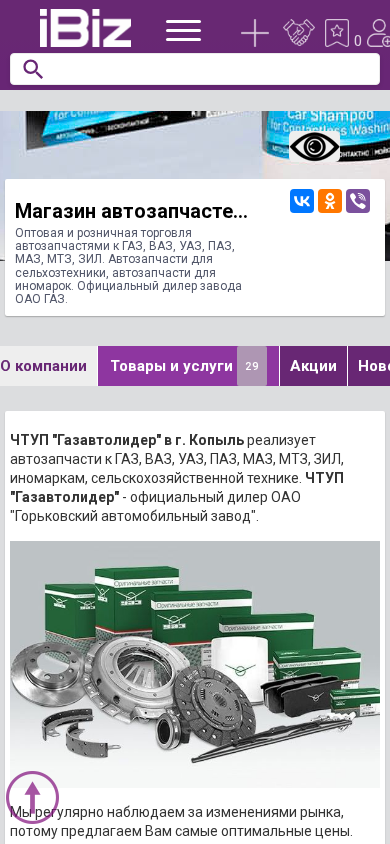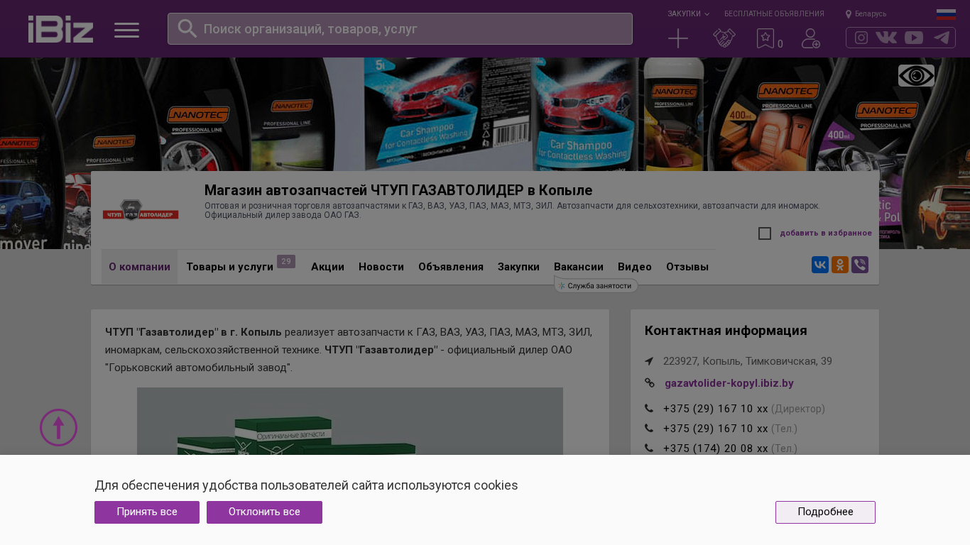 | Название / Заголовок | Магазин автозапчастей ЧТУП ГАЗАВТОЛИДЕР в Копыле - Оптовая и розничная торговля автозапчастями к ГАЗ, ВАЗ, УАЗ, ПАЗ, МАЗ, МТЗ, ЗИЛ. Автозапчасти для сельхозтехники, автозапчасти для иномарок. Официальный дилер завода ОАО ГАЗ. . 223927, Копыль, , Тимковичская, 39 |