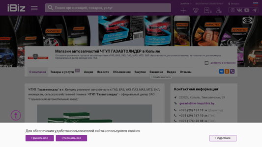| AI-анализ | This website is an auto parts store named Газавтолидер located in the city of Копыле, Belarus. The store offers both wholesale and retail sales of auto parts for various vehicle brands including ГАЗ, ВАЗ, УАЗ, ПАЗ, МАЗ, МТЗ, ЗИЛ, and for agricultural machinery as well as for foreign brands. The store is an official dealer of ОАО ГАЗ. The website provides a map for directions, contact information, and the store's address is listed as Тимковичская, 39 in Копыль, with the postal code 223927. The store also has branches in Слуцк and Солигорск, and one of its partners is the service station "Линия качества". The company accepts both cash and non-cash payments and offers delivery |