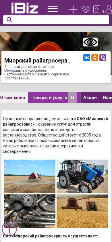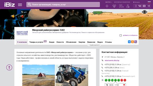 | Название / Заголовок | Миорский райагросервис ОАО - Запчасти для сельхозтехники. Минеральные удобрения. Растениеводство. Ремонт и сервисное обслуживание.. 211287, Миоры, , Кирова, 2 |