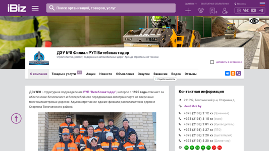 | Название / Заголовок | ДЭУ №8 Филиал РУП Витебскавтодор - Строительство, ремонт, содержание автомобильных дорог. Аренда строительной техники.. 211092, , Старинка д. |