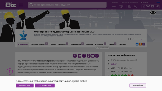 | AI-анализ | The portal "Stoytrest No. 3 Order of the October Revolution OAO" is a complex construction company based in Soligorsk, Belarus, with addresses in Slutsk and Soligorsk. The company specializes in the comprehensive construction of objects, their reconstruction, extension, reprofiling, technical reequipment, and capital and current repairs. The company is owned by the Minsk regional executive committee and has several branches, including SU-55 in Slutsk, SU-95 and SU-123 in Soligorsk. Each branch has its own contact information and working hours, which are listed on the website. The company has been in operation since 1958 and offers a wide range of construction services, from simple to complex projects. |