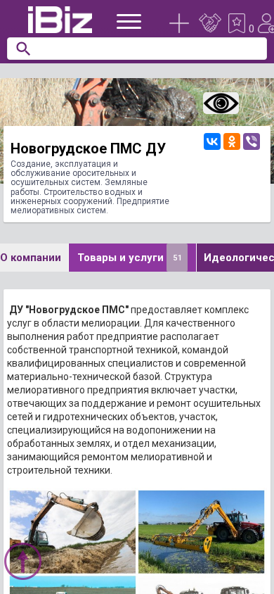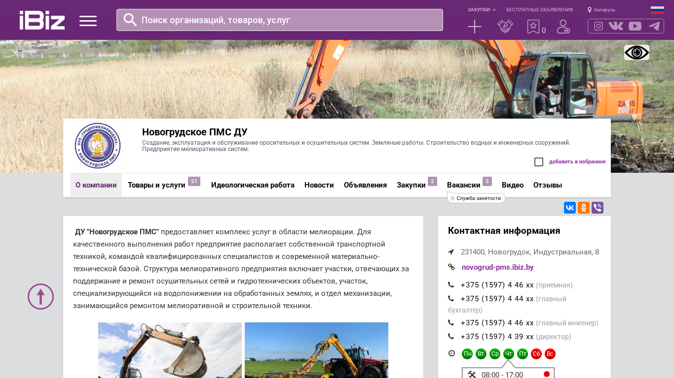 | AI-анализ | This online resource is a company website for "Novogrudskoе ПМС ДУ" located in Industrialna Street, Novogrudoch, Belarus. The business specializes in the creation, operation, and maintenance of irrigation and drainage systems, as well as earthworks and the construction of water and engineering structures. It is a company for meliorative systems. The website provides information about the company's services and offerings, including the repair and maintenance of specialized machinery and equipment. The site also includes sections for news, job vacancies, and customer reviews on social media platforms. The company offers services such as the construction of meliorative systems, the construction of water and engineering structures, the repair of meliorative systems, the repair of specialized equipment, technical maintenance of meliorative systems, and technical maintenance of equipment. The company aims to maintain and modernize meliorative systems to optimize |