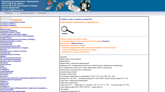 | AI-анализ | --- The website is an electronic components supplier based in Minsk, Belarus. It offers a wide range of domestic and imported radio components, including electronic devices, microchips, diodes, capacitors, resistors, and switches. The site provides a catalog with products from various international and local manufacturers, technical data sheets, and search functionality for electronic components. The company also features news, information about the company, and contacts. |