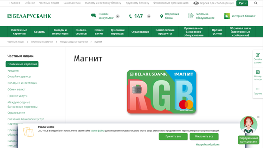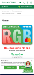 | AI-анализ | This website belongs to Belarusian bank ASB Belarusbank and is titled "Карта Магнит" (Magnet Card). The description mentions several programs for this card: Red, Green, Blue, and allows for overdraft credit usage. Keywords include "карта рассрочки магнит" (magnet card for credit) and relevant terms such as "кредит" (credit), "сумма" (sum), "без ограничений" (without limitations), and "задолженности" (debts). The website includes sections for the bank, press center, bank today, rewards for bank operations, real estate, employment, investor information, confidential information, procedures for citizen requests, individual customers, payment cards, loans, online services, deposits and investments, currency exchange, other services, international banking transfers, insurance, and partnership |