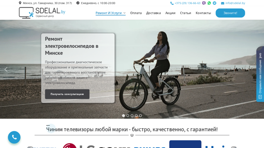 | AI-анализ | The portal Sdelal.by is a service center in Minsk, Belarus, located at ul. Gamarnika, 30 (pom. 317). It offers repair services for televisions, bicycles, electric scooters, and vacuum cleaners. The repair shop operates every day from 10:00 to 20:00, and contact information is provided by phone number +375 (29) 136-66-63 or email info@sdelal.by. The center repairs various brands, including Samsung, Sony, Sharp, Supra, LG, Philips, Panasonic, Toshiba, Thomson, BBK, Grundig, Erisson, Funai, Hitachi, Haier, Horizont, Rolsen, TCL, Vityas, Vizio, Xiaomi, Ju |