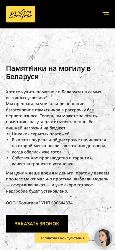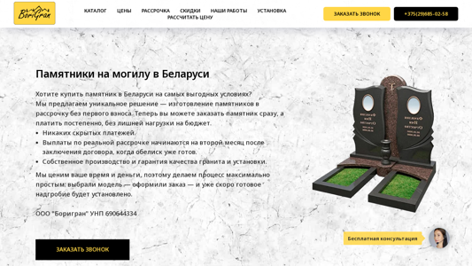 | AI-анализ | --- The website offers a catalog of memorial stones for sale in Belarus, providing photos and prices for various options. Customers can order and pay in installments with no initial payment required. The production and installation of the stones are guaranteed, with a focus on natural granite and marble sourced from reliable suppliers worldwide. The catalog includes various types of memorial stones, such as single, horizontal, and double options, with prices starting from 820 Belarusian rubles for single stones and 990 Belarusian rubles for horizontal and double stones. The website is operated by OOO "Borigran" with UNP 690644334. |