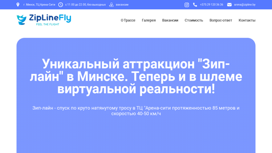 | AI-анализ | This online resource is dedicated to the unique zipline attraction in Minsk, Belarus. The zipline is a thrilling slide down a steep, taut rope in the Arena City shopping center, measuring 85 meters in length and reaching speeds of 40-50 km/h. Visitors can choose from various seating positions, including lying down (superman style) and sitting, with the option of wearing VR headsets for an enhanced experience. The zipline course is open daily from 11:00 to 22:00, without weekends, and can be accessed by contacting +375 29 120 36 36 or emailing arena@zipline.by. The zipline is located within the Arena City shopping center and features a safety-first approach, with professionals overseeing |
