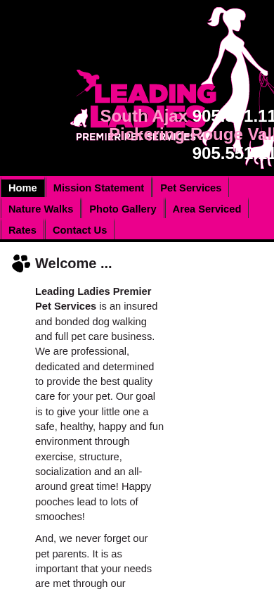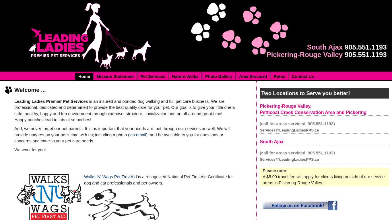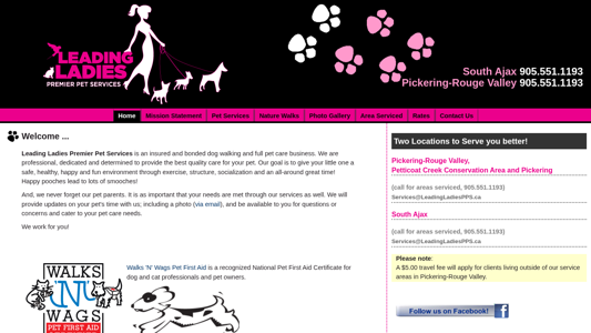 | AI-анализ | The web project "Leading Ladies Premier Pet Services" is an insured and bonded business that offers dog walking and full pet care services. The company aims to create a safe, healthy, happy, and fun environment for pets through exercise, structure, socialization, and regular walks. The website provides information on two service locations in Pickering-Rouge Valley and South Ajax, along with contact details and rates. The business also mentions its use of Walks 'N' Wags Pet First Aid certification for pet professionals and pet owners. The site offers a photo gallery and a mission statement, and notes a $5 travel fee for clients outside of the serviced areas. |