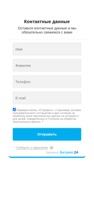 | AI-анализ | This online resource is a contact form for the company B24-UZFACK, operating under the domain name b24-uzfack.b24site.online. The title and description of the page are dedicated to providing users with instructions on how to submit their contact information to the company. Users are required to enter their name, surname, phone number, and email address, and accept the company's user agreement and data processing terms by clicking the "Отправить" (Send) button. The form also includes an option to report any violations of the contact form's content. The form is available in multiple languages, including English. The keywords associated with this page include "contact details," "send," "receive," and "agreement." The most frequently occurring words are "contact details," "data," "send," "receive," and "agreement." The page is developed using |