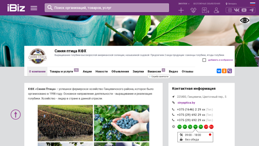 | AI-анализ | This online resource is a farm called "Blue Bird CFH," specializing in the cultivation of high-growing American garden blueberry varieties. The website offers two types of products: blueberry seedlings and blueberries. The farm is located at 225400, Gantsevichi, , Flower Garden Street, 5. The website also includes a map for directions, contact phone numbers, and the farm's address. |