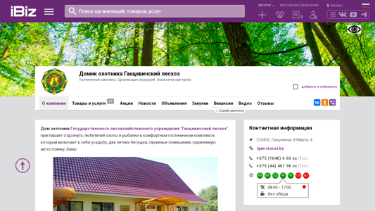 | AI-анализ | This online resource is for the Ganetsovich Forestry Enterprise's Hunter's Lodge and Hotel Complex, which offers accommodation, organization of tours, and an ecological trail. The company is located at 225432, Gantsevichi, Minsk region, Belarus. The complex includes a hunting lodge, two summer houses, garages, an observable parking lot, and a sauna. The lodge is situated on the territory of Barkov Forestry, known for its picturesque landscapes, ecological trails, and attractions. The complex provides 4 bedrooms with a total capacity of 10 beds (2 double, one four-bed, and one luxury room). Facilities include bathrooms, a kitchen with necessary equipment, a banquet hall, a tennis court, cable TV, and a barbecue and campfire area. The complex is |