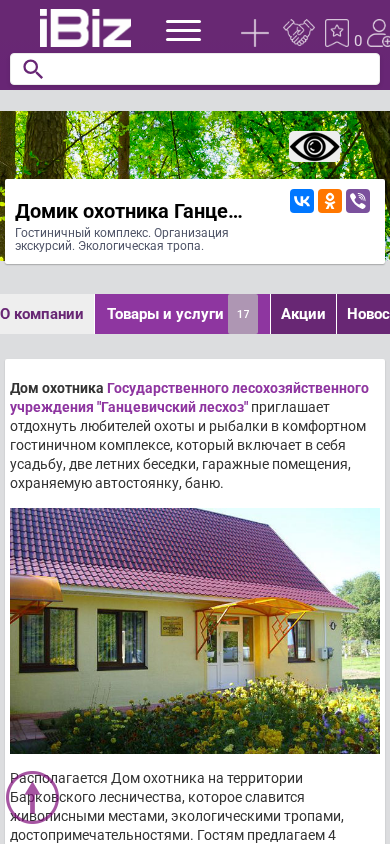 | Название / Заголовок | Домик охотника Ганцевичский лесхоз - Гостиничный комплекс. Организация экскурсий. Экологическая тропа.. 225432, Ганцевичи, , 8 Марта, 4 |