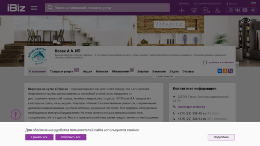 | AI-анализ | The website is for a rental apartment business named Козак А.А. ИП (Company of A.A. Козак) located in Pinsk, Belarus. They offer short-term rentals of one, two, and three-bedroom apartments for hours, days, or weeks. The apartments come with report documents, excellent repair, ideal cleanliness, and convenient furniture. The address is given as Зои Космодемьянской, 33-19. The website contains information about the company, its products and services, and various announcements, vacancies, and user reviews. The company specializes in daily apartment rentals, which are popular among young couples, business travelers, and foreign guests. The apartments feature modern design, quality repair, and necessary appliances including a microwave oven, refrigerator, stove, and dishes. The business also offers document services |