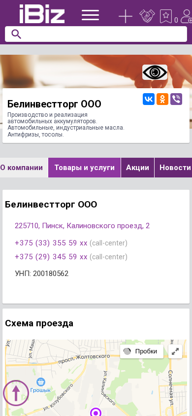 | AI-анализ | This online resource is a Belarusian company, Belinvestторг OOO, located in Pinsk, Minsk region, with the address at Kalinovskogo project 2. The website specializes in the production and sale of automobile accumulators, as well as automobile, industrial oils, antifreezes, and tosols. The company offers a range of products including batteries, elements of vehicle power supply, automotive oils and lubricants, filters, and automotive parts and accessories. The website also features information on company details, products, and services, as well as contact information with phone numbers for a call center. The company's UNP number is 200180562. The website is accessible at belinvt.ibiz.by. Business hours are from 9:00 to 18:00, Monday |