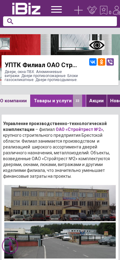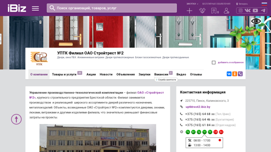 | AI-анализ | language: en The website is for the Production and Technical Equipment Coordination Branch of OAO Stroytrest No. 2, a large construction company in the Brest Oblast of Belarus. The branch specializes in the production and sales of a wide range of doors and metal products, including PVC windows, aluminum doors and windows, fireproof doors, smokeproof doors, and concrete blocks. The company's doors and windows are used to equip buildings constructed by OAO Stroytrest No. 2, reducing the financial burden on construction projects. The branch offers and sells various metal products such as gutters and doors, fireproof and smokeproof doors, PVC windows, doors for entrances, interior doors, and windows and vitrages made of aluminum. The company's solid experience in the market of construction materials allows it to handle orders of any complexity and volume. It |