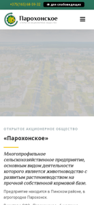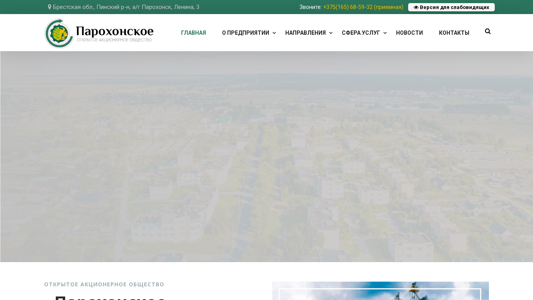 | AI-анализ | The web project 'Открытое акционерное общество «Парохонское» - официальный саit' is the official website for Open Joint Stock Company 'Парохонское', one of the largest agricultural enterprises in Belarus in the fields of crop farming and livestock production. The company, which is located in Pinsk District, agro-town of Parohonsk, focuses primarily on livestock breeding with a well-developed crop farming sector on a solid own feed base. The enterprise consists of six dairy-cattle complexes, a complex for raising and fattening young cattle, and a farm for breeding cows for reproduction. Additionally, there are six agricultural production sites and auxiliary productions, including a fuel briquette plant, a grain drying complex, a feed production facility, a seed |
