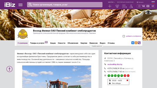 | Название / Заголовок | Восход Филиал ОАО Пинский комбинат хлебопродуктов - Производство сельскохозяйственной продукции. Мясо-молочное животноводство. Зерновые.. 225761, , Кончицы д., Советская, 5 |