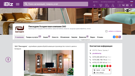 | AI-анализ | The portal Pinskdrev Holding Company ZAO is a manufacturing and sales company for soft furniture, solid furniture, mattresses, wood processing products, and matches, located in Pinsk, Belarus, at Chuklia, 1. The website provides a scheme for reaching the company, contact telephone numbers, and the address. The main products and services offered by Pinskdrev Holding Company ZAO include woodworking, equipment, internet-stores, furniture - soft and solid, kitchens and facades. Additionally, they provide wooden boards, spools of twine, windows and doors made of PVC, fuel briquettes, wooden and pine products, and pilings. The company, which is the largest wood processing plant in Belarus, includes a forestry enterprise in Pinsk, a plywood mill, a woodchip board factory, a sawmill and |