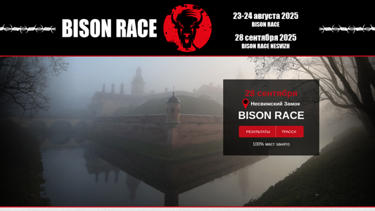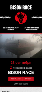 | AI-анализ | The web project "Bison Race - Гонка с препятствиями" (Bison Race) is dedicated to an extreme running event taking place in Belarus on two different dates: August 23-24, 2025, and September 28, 2025. The event, named 'Bison Race', takes place at the Neсвижский Замок (Nesvizh Castle). The website provides information about the races, results, and a video section featuring videos about the autumn start. Bison Race is the first extreme running event in Belarus, which involves participants overcoming various natural and artificial obstacles. Extreme running originated in ancient times when humans had to literally fight for their lives to survive and feed themselves. Bison Race aims to help participants discover the instincts within them. Unlike typical cross-country races, extreme running is |