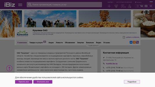 | AI-анализ | The portal kushliki.ibiz.by is a mixed agricultural enterprise, specializing in the production and bulk sale of potatoes and their processing. Additionally, it engages in livestock farming for milk and meat production, cultivation of cereals and legume crops, and vegetable farming. The company, OAO "Kushliki," is located in the village of the same name, in the Central District, in the region of Belarus. It is a leading agricultural enterprise in the Posolsky district of the Vitsebsk region. The company focuses on potato cultivation in 200 hectares, collaborating with the Grodno Zonal Institute of Agriculture of the National Academy of Sciences of Belarus to experiment with various potato varieties. Other significant areas of activity include livestock farming, fodder procurement, and the cultivation of marketable agricultural |