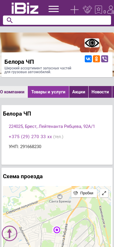 | AI-анализ | This website is a Belarusian company, Belora CHP, specializing in the wide range of spare parts for heavy duty trucks. The company's address is in Brest, Leyteнанта Rябцева street, 92А/1. The website provides a map for directions, contact phone number +375 (29) 270 33 xx, and UNP number 291668230. Business hours are from 9:00 to 18:00, Monday through Friday, with Saturdays and Sundays being holidays. The company offers various services and products related to heavy duty trucks, including parts, purchases, and vacancies. Additionally, the website includes news, testimonials, and contact information for the company. The website is categorized under 'Spare parts for heavy duty trucks' and 'Sp |