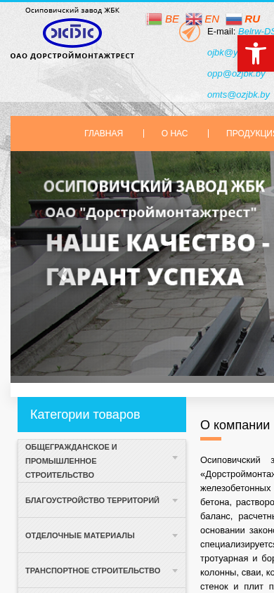 | AI-анализ | This online resource is a website for OZJBK OAO "Dorstruymontazhtrust," which operates the Osipovich Concrete Structures Plant. The site provides information about the company, its products, and contact details. The most frequently used words on the site include "железобетонные" (concrete structures, constituting about 20% of all words), "плиты" (plates, 11%), "375," and "2235." The site also features sections for sales and supplies, and contact information is provided for various departments including sales, snaabging, and the economic department. The website offers products for civil and industrial construction, including multi-chamber concrete slabs, beam and column elements, and foundation elements. The contact email addresses are belrw-dst-ojbk@yandex. |
